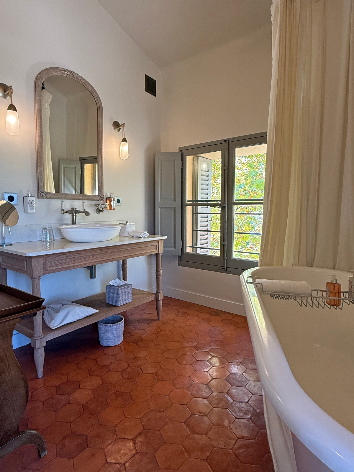 Our large and open Prestige Room, located in the historic wing, perfectly captured this balance. Overlooking the grassy lawn and gardens beyond, it featured a working fireplace, a canopy bed wrapped in billowy white linens with soft tiebacks, and interiors dressed in weathered woods and a soothing palette of creams and gray-blues. The windows still have their original locks and hinges, and opening them put the quiet beauty of the gardens on full display, with the soft murmur of the fountain in the rear courtyard drifting in from outside. Our bathroom was equally spacious, centered around a freestanding soaking tub with a curtain enclosure for added privacy.