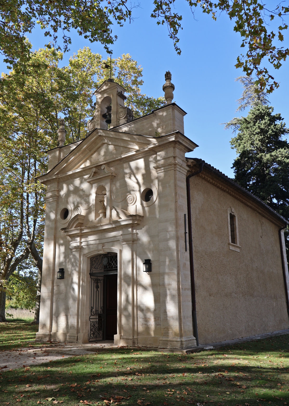 Ornamental ponds and water features mingle with 18th-century sculptures throughout, and a 300-year-old bald cypress sits just outside Le Temps Suspendu, so massive it shades the alfresco terrace in summer. The property also includes a pretty little chapel, originally built for the family’s private use, that’s now popular for onsite weddings.