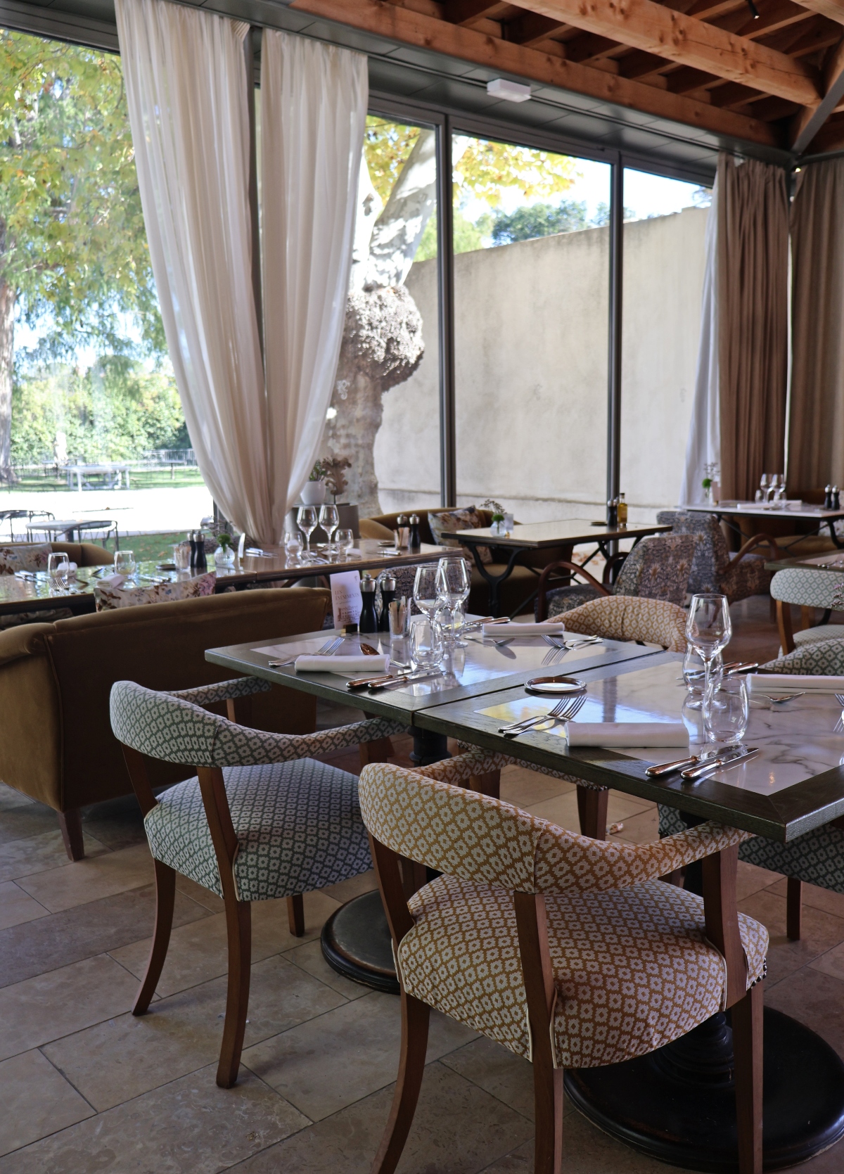The property offers two main restaurants plus a pair of lounges. A daily breakfast buffet, lunch, dinner and Sunday brunch are served in Le Temps Suspendu, a casual, airy space with raw-beamed ceilings and glass walls that overlook the gardens. In warmer months, an outdoor terrace carries the dining experience into the estate’s parkland. Everything we tried was delicious, from the array of fresh pastries each morning to a simply prepared filet of sea bream paired with pesto mashed potatoes one evening. The wine list is a standout — Château de Fonscolombe produces its own organic reds, whites and rosés from the onsite vineyards — and there’s a kids’ menu with simple fare like tomato-and-mozzarella soup and buttery pasta with ham.